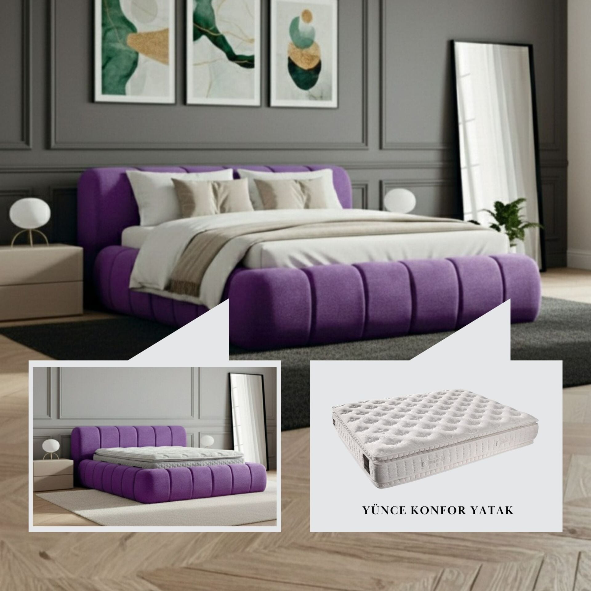 Arel Yatak Baza Başlık Set ve Yünce Konfor Yatak kombinasyonu, modern tasarımı ve doğal malzemeleri ile yatak odanızı üst segment bir yaşam alanına dönüştürür. Hem estetik görünümü hem de sağlıklı uyku deneyimi ile her geceyi ayrıcalıklı hale getirir.