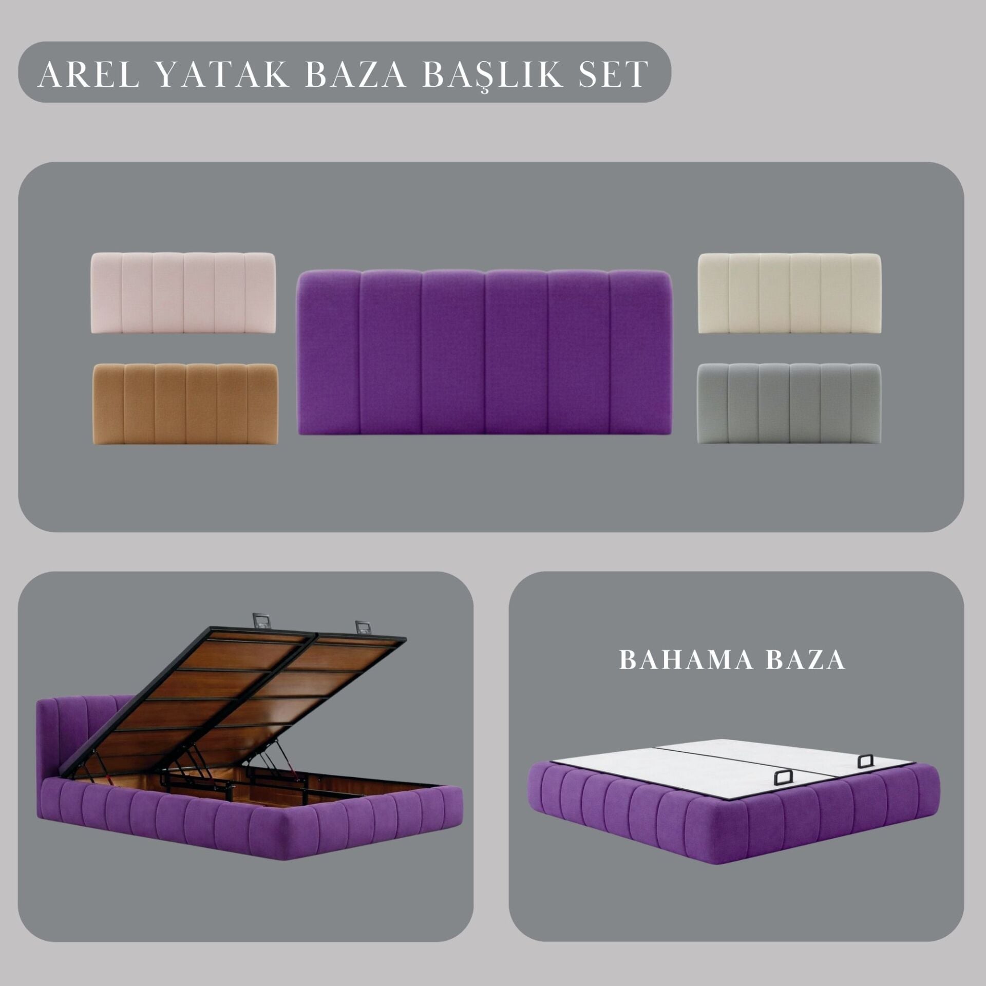 Arel Yatak Baza Başlık Set, farklı kumaş ve renk alternatifleri ile üretilebilmektedir. Standart seçenekler ürün varyantlarında yer almaktadır.