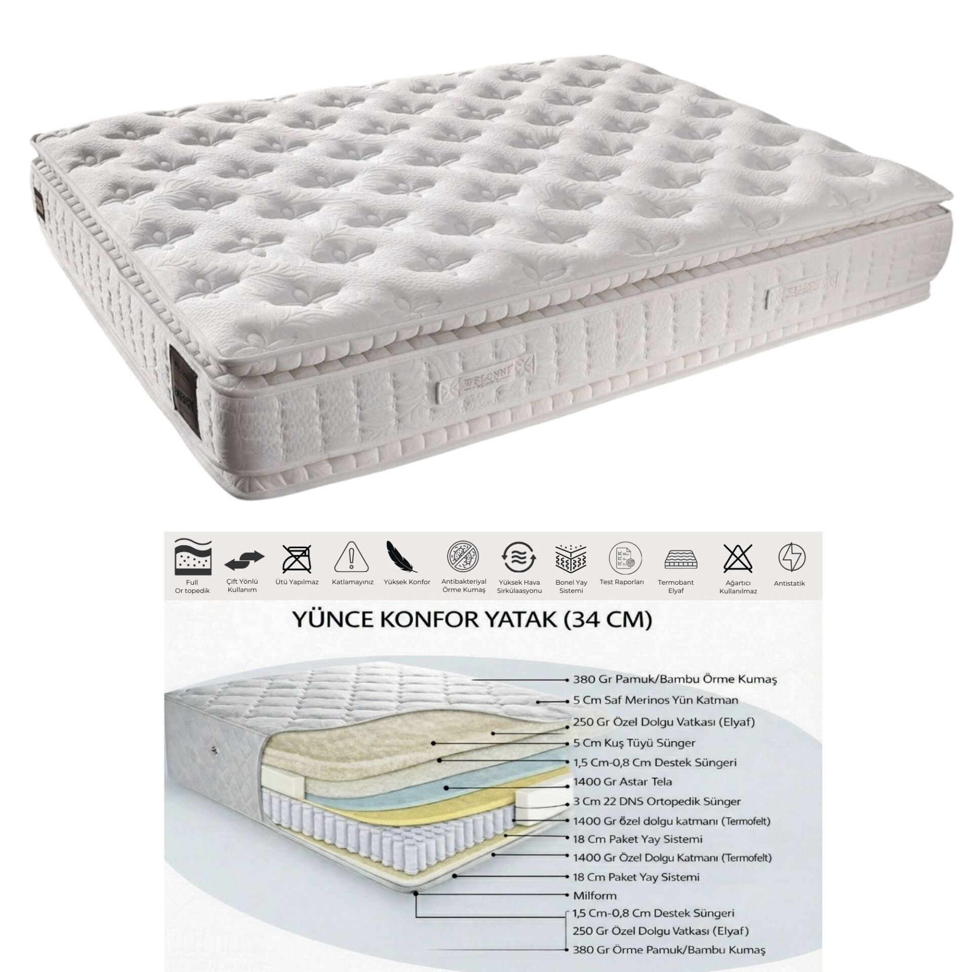 İçeriğindeki saf Merinos yün katmanı, dört mevsim ideal uyku sıcaklığı sağlarken; kuş tüyü sünger katmanı vücudu nazikçe sararak maksimum yumuşaklık ve ağırlıksız bir uyku hissi oluşturur.