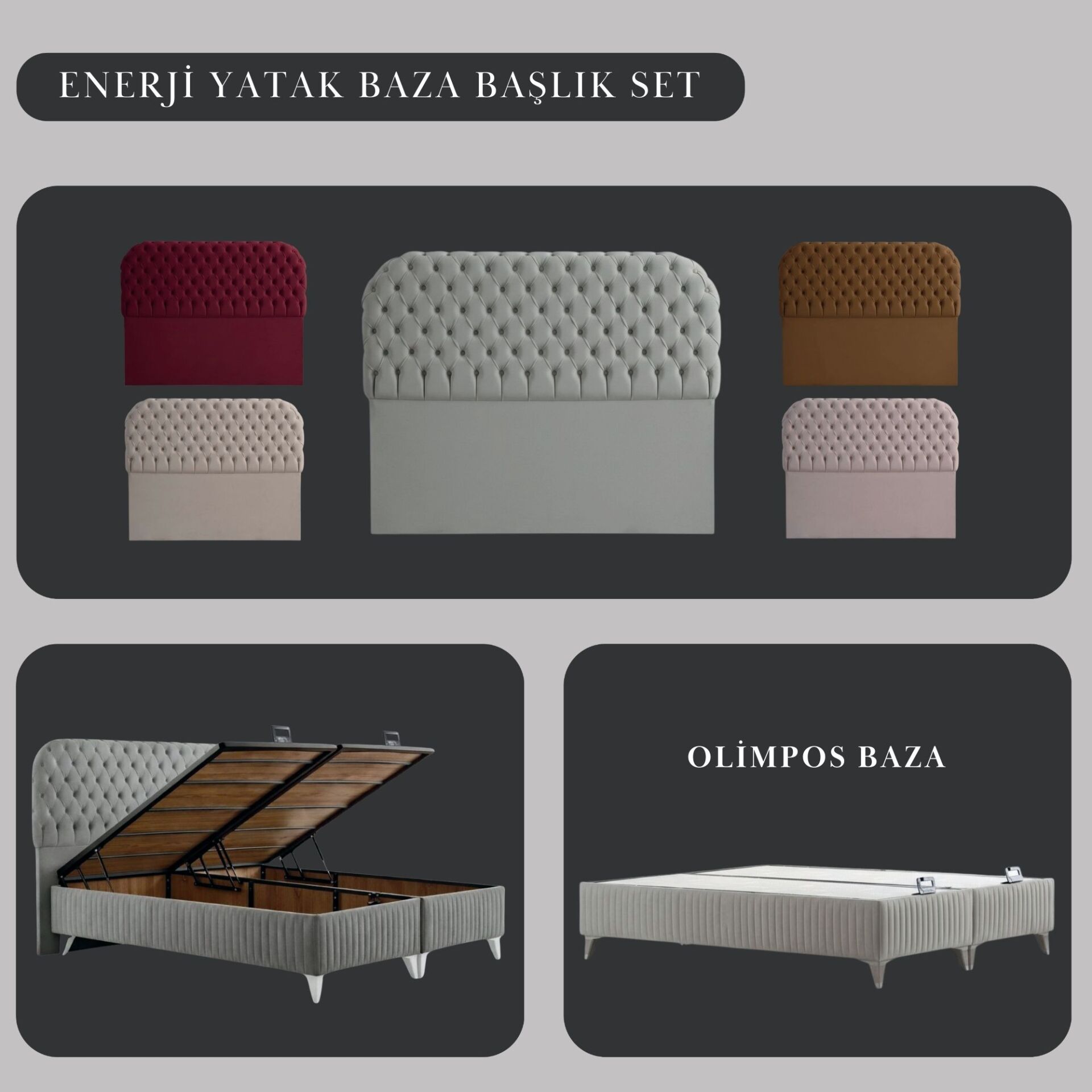 Enerji Yatak Baza Başlık Set, farklı kumaş ve renk alternatifleri ile üretilebilmektedir. Standart seçenekler ürün varyantlarında yer almaktadır.