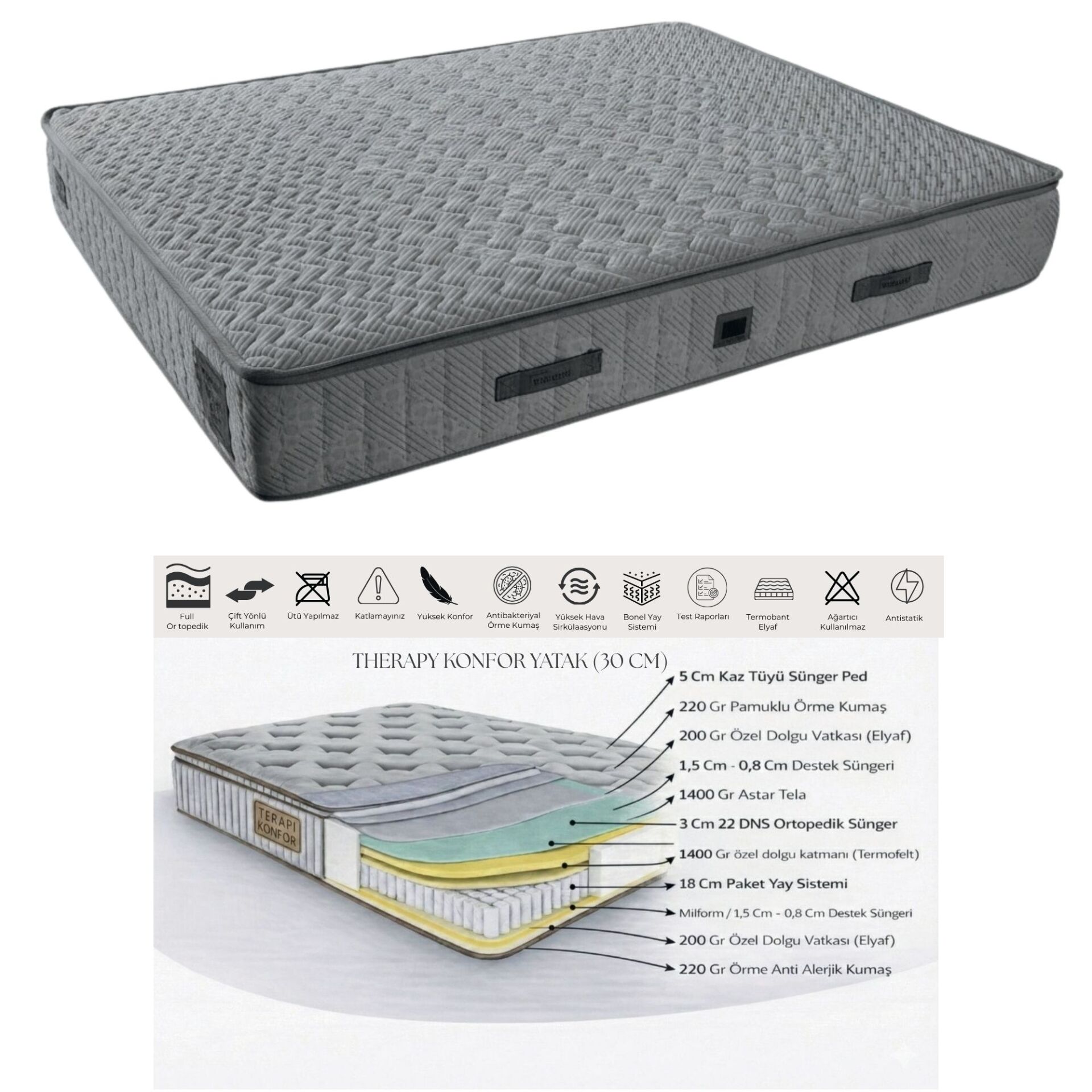 Enerji Set, Terapi Konfor Yatak ile birlikte sunularak konforu en üst seviyeye taşır. 30 cm yüksekliği ve gelişmiş katman teknolojisi ile tasarlanan bu özel yatak, vücudunuzu her noktadan desteklerken kesintisiz bir uyku deneyimi sunar.