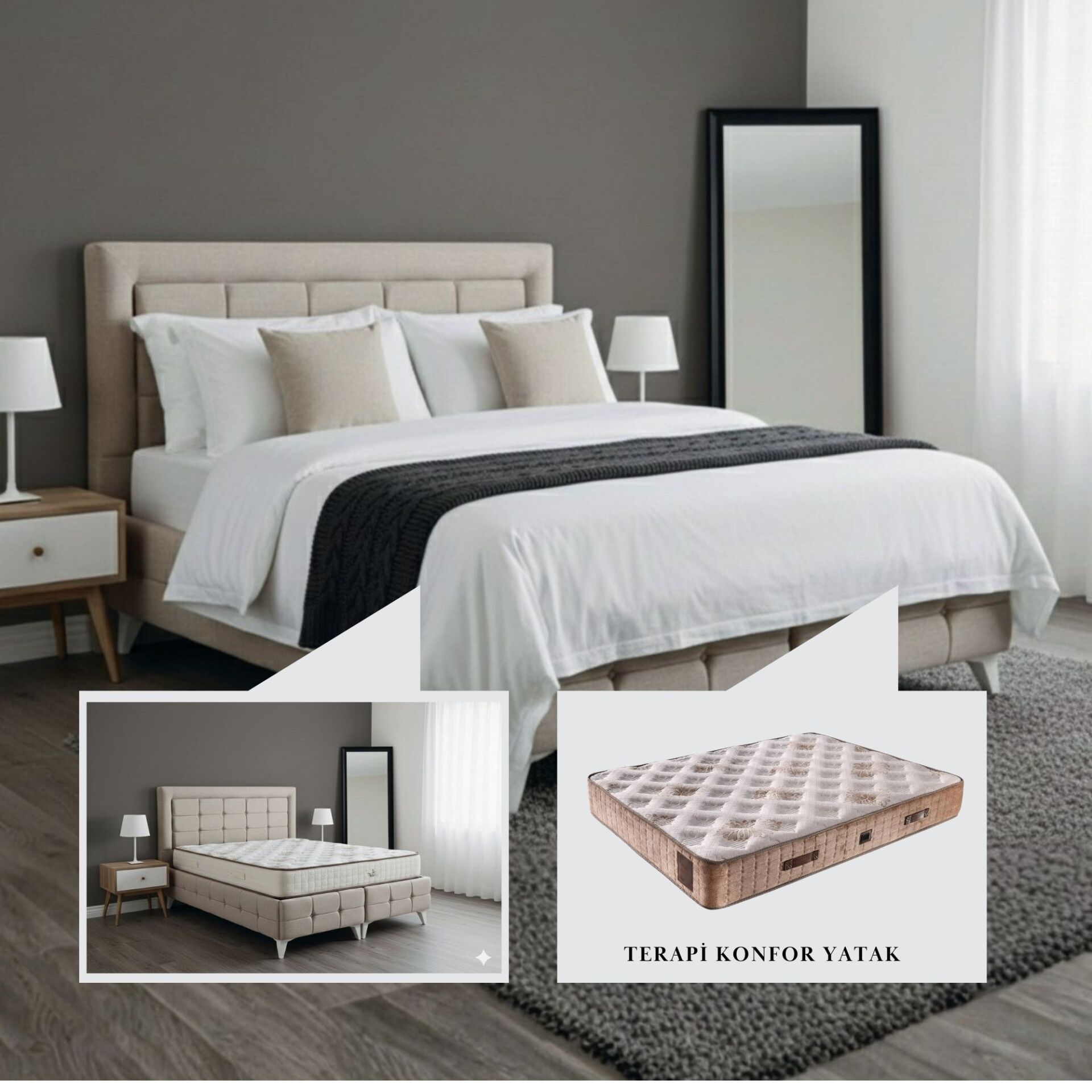 Lorenzo Yatak Baza Başlık Set ve Terapi Konfor Yatak kombinasyonu, modern tasarımı ve ileri konfor teknolojisi ile yatak odanızı üst segment bir yaşam alanına dönüştürür. Estetik görünüm, sağlam yapı ve konforlu uyku deneyimini bir arada sunarak her geceyi ayrıcalıklı hale getirir.