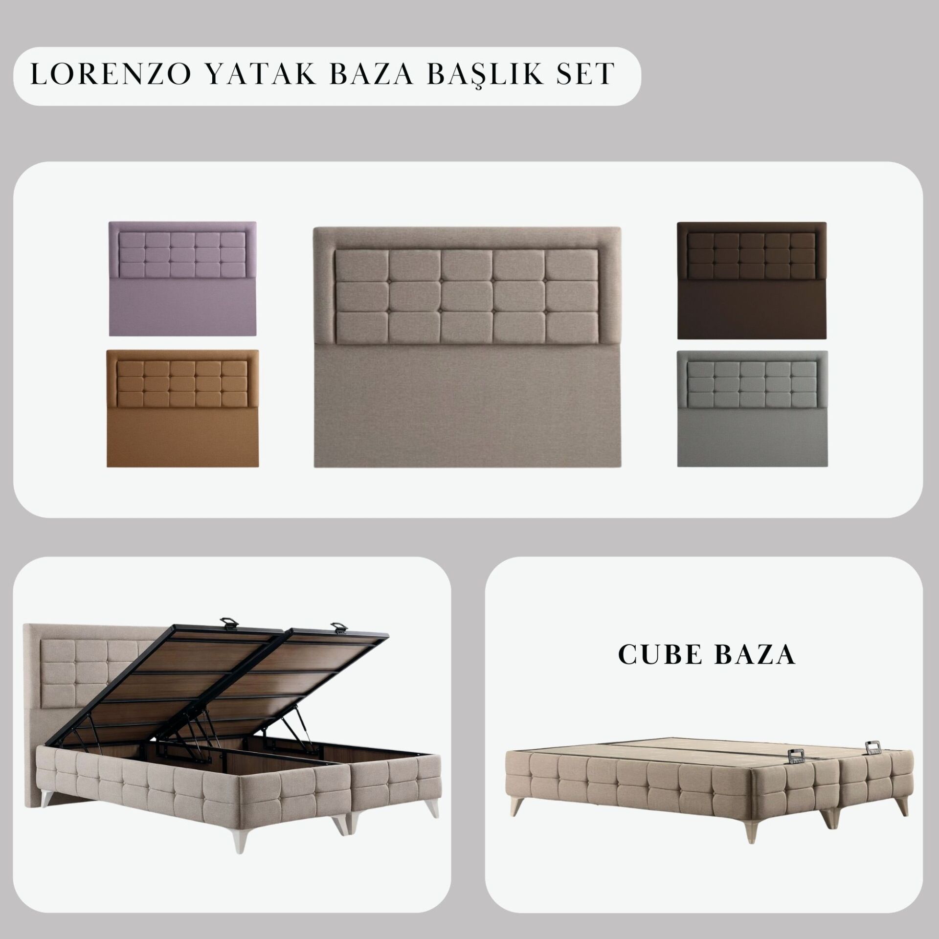 Lorenzo Yatak Baza Başlık Set, farklı kumaş ve renk alternatifleri ile üretilebilmektedir. Standart seçenekler ürün varyantlarında yer almaktadır.