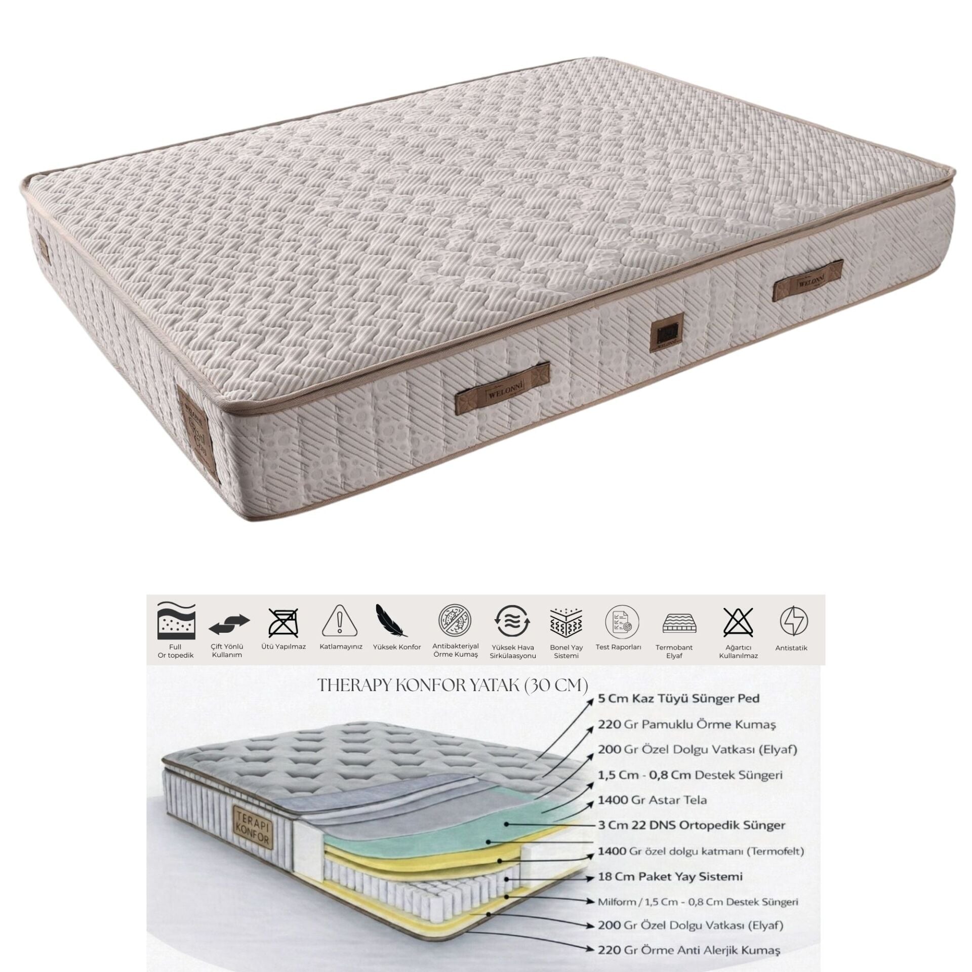 İçeriğinde bulunan 5 cm saf Merinos yünü, yatağın nefes almasını sağlayarak dört mevsim ideal uyku sıcaklığı sunar. Üst katmandaki kuş tüyü sünger, vücudunuzu nazikçe sararak basınç noktalarını azaltır ve adeta bulut hissinde bir konfor sağlar.