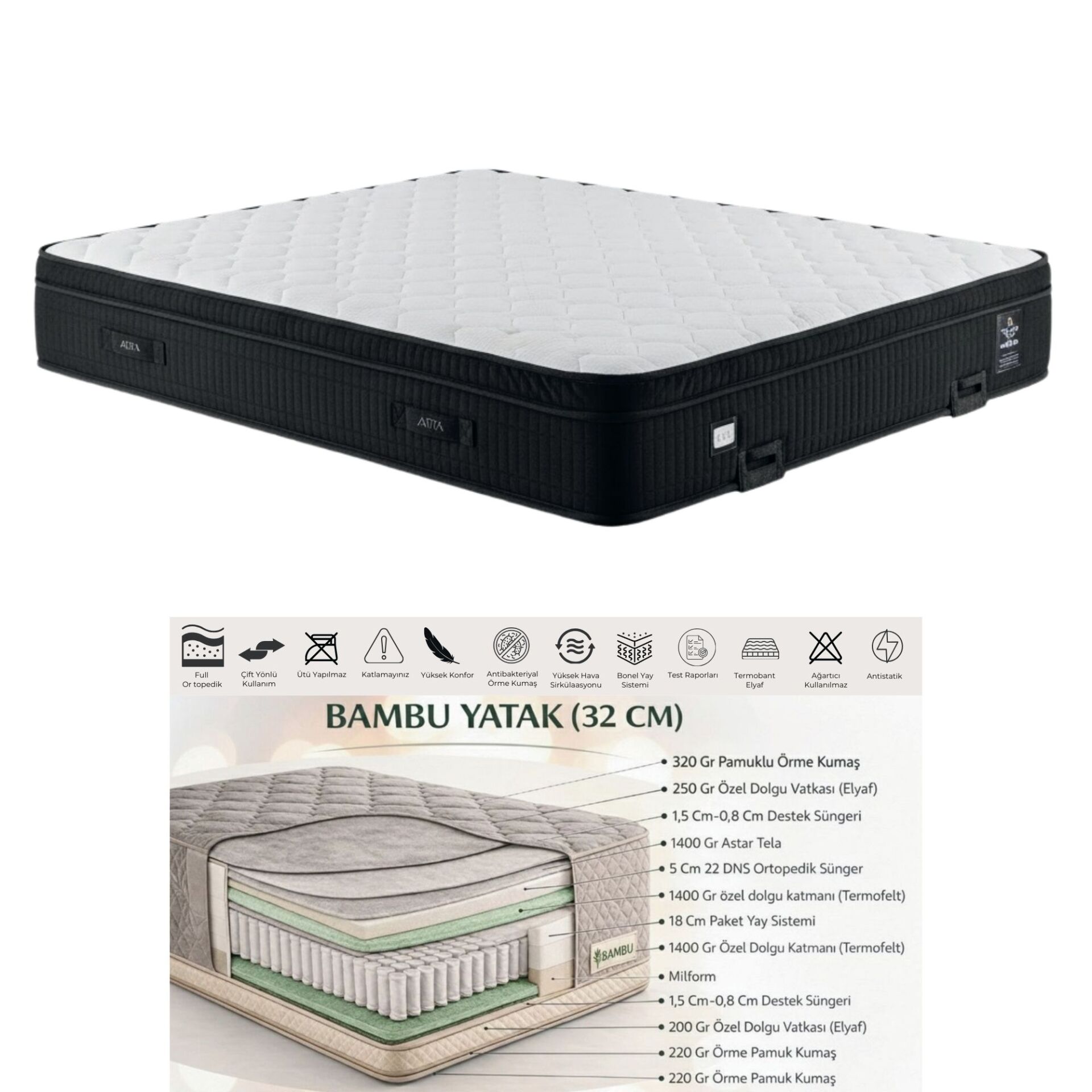 Valensi Set, Bambu Yatak ile birlikte sunularak doğal ferahlık ve ortopedik desteği bir araya getirir. 32 cm yüksekliği ve gelişmiş katman yapısı sayesinde vücudu dengeli şekilde desteklerken, her mevsim konforlu bir uyku deneyimi sağlar.